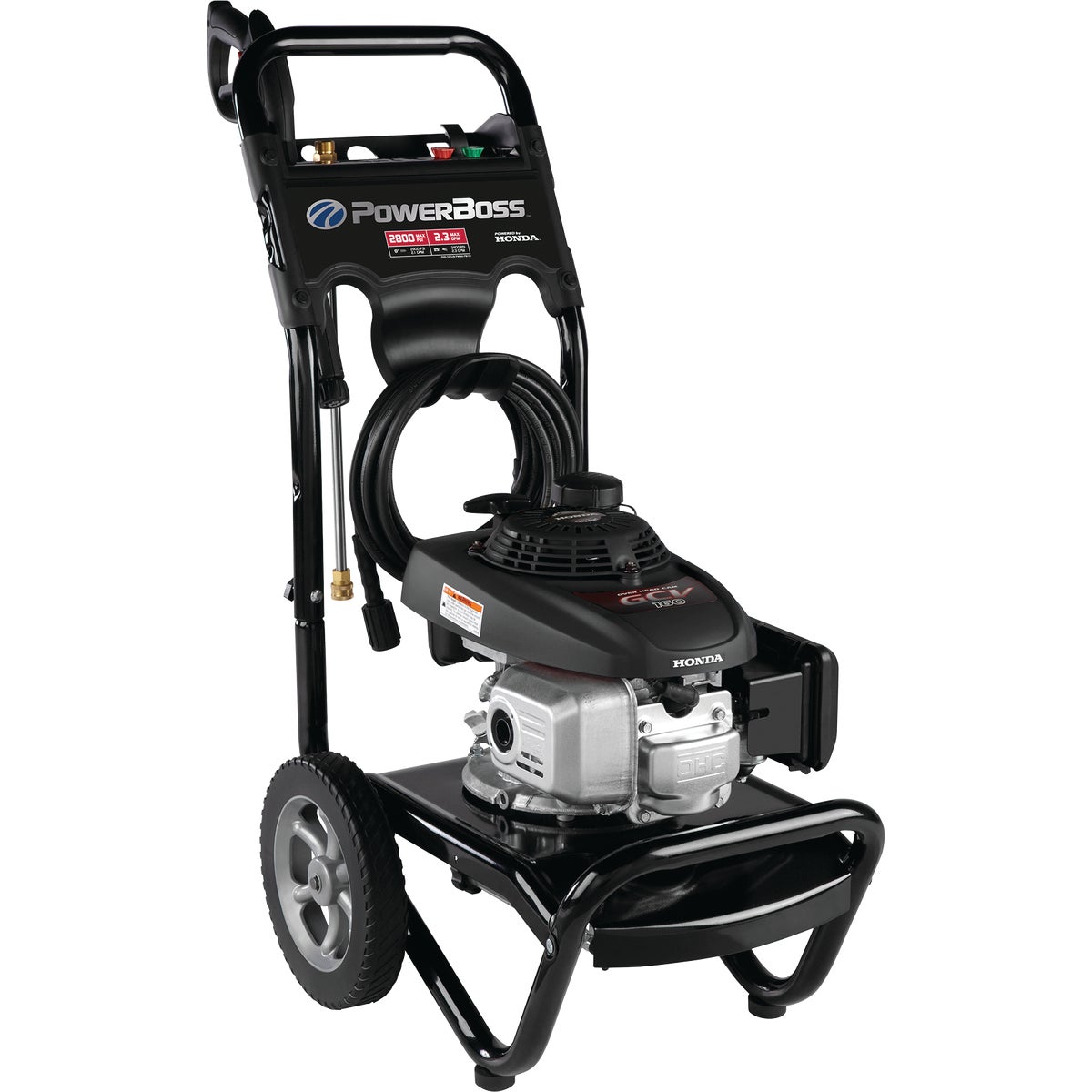 PowerBoss Gas Pressure Washer is powered by the Honda GCV160 OHV engine. Maintenance free axial cam pump includes thermal relief valve, EasyStart system, and detergent injection system to siphon cleaning solution into the water stream for faster and easier cleaning. Recoil starter. 4.4 HP. 1 Qt. fuel tank. Includes: 25 Ft. PVC high pressure hose (1/4 In. diameter), high pressure gun with auto safety lock, and steel lance with 3 quick connect nozzles - Soap, 0 degree, and 40 degree. No. 020574: Pressure Rating: 2800 psi, Flow Rate: 2.3 GPM, Water Type: Cold, Pump Type: Axial Cam, Hose Length: 25 Ft., Engine: Honda GC, Engine Capacity: 160 cc, Detergent Tank: No, Number Of Tips: 3, Wheels: Yes, Frame Material: Powder Coated Steel, Weight: 60 Lbs., Dimensions: 19 In. W. x 22.5 In. H. x 25 In. L., Warranty: 2 Yrs., Pkg Qty: 1, Package Type: Box